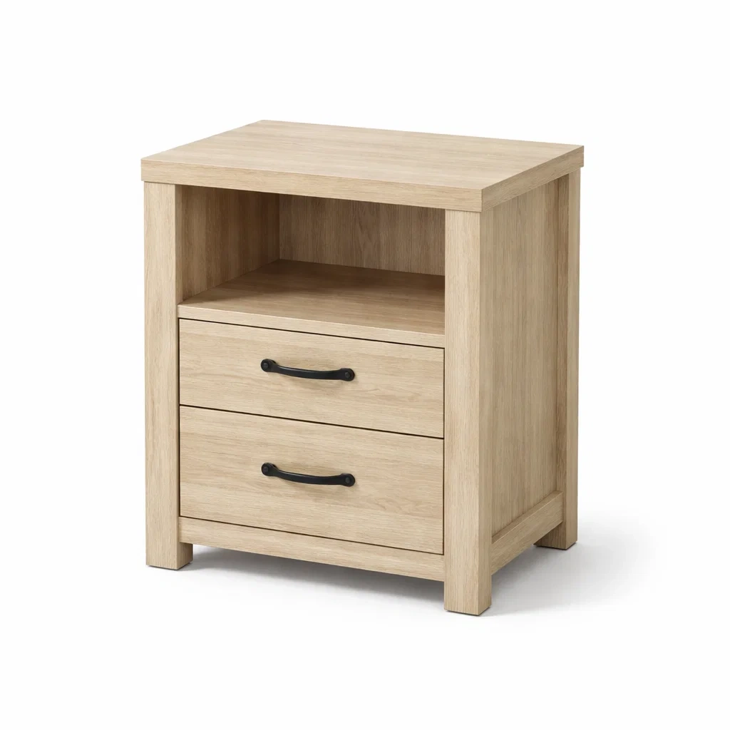 Der Nachtschrank besteht aus MDF mit einer Eiche-Dekor-Oberfläche. Die Schubladenschienen sind aus Metall.
